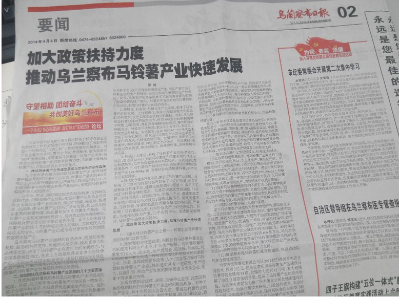 4月4日,烏蘭察布日?qǐng)?bào)發(fā)表內(nèi)蒙古民豐薯業(yè)有限公司總經(jīng)理張國(guó)關(guān)于《加大政策扶持力度,助推馬鈴薯產(chǎn)業(yè)快速發(fā)展》的文章,文章指出: